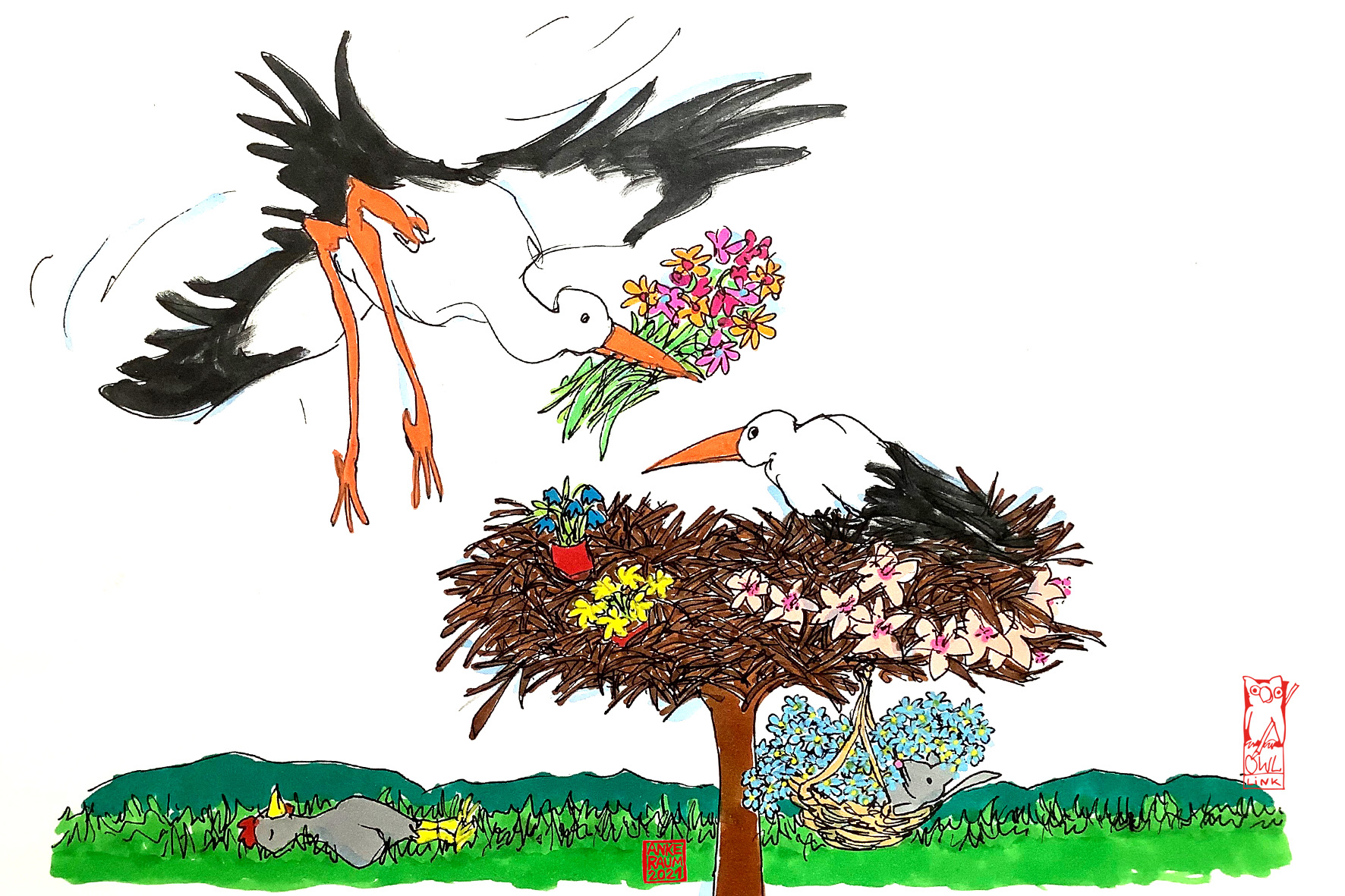Die neuen alten Nachbarn aus Afrika sind zurück. Sie schmücken ihr Nest mit Frühlingsblumen aus den Blumenläden, aus Baumärkten und aus den Supermärkten, den Hofläden und von den frischen, saftigen ostwestfälischen Wiesen.